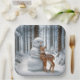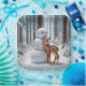 Eine skurrile Szene in einem schneebedeckten Wald bietet einen freundlichen Schneemann mit Karottennase und dadavor ein blasses Gesicht.