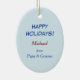Dieser glückliche Schneemann hat mehrere Freunde, die zu Besuch gekommen sind, darunter ein Rot-Kardinal-Vogel, ein Eichhörnchen, ein Hasen und sogar einen Schnupfen! Ein kleiner Vogel steht auf seinem Besen. Ein hübscher, kreisförmiger Himmelshintergrund rundet das einzigartige Retro-Urlaubssymbol dieses Weihnachtsschmucks ab. Die Rückseite ist hell blau, mit Textfeldern für die individuelle Gestaltung Ihrer eigenen Nachricht.