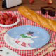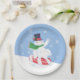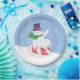 Ein glücklicher Schneemann sitzt auf einer Pfefferminzscheibe, während er einen schneebedeckten Hügel hinunter gleitet. Original Illustration von Noël Snow.
