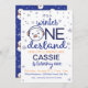 Winter Einladung zum ersten Geburtstag. Winterwunderland mit niedlichen Schneemännern.