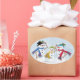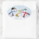Drei Schneemänner im Schnee mit bunten Hüten und Schals.