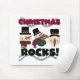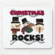 Weihnachtsgestein! Drei fröhliche Urlaubsschneemänner in Herbergshüten und Winterschals, musikalische Noten und Schwarz-Rot-Text mit dem Aufdruck "Christmas Rocks!" werden auf den Weihnachtsschneemannskarten, T - Shirt, Sweatshirts, Tasse und anderen Urlaubsbekleidung und Geschenkartikeln vorgestellt.