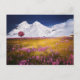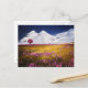 Diese Postkarte zeigt einen Blick auf die weißen, schneebedeckten Alpen mit einer Vordergraswiese aus rosa Blume und goldenen Gräsern.