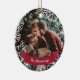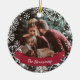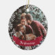 Festliche Weihnachtsschmuck aus dem Foto mit einem beliebten Foto auf beiden Seiten, gerahmt von einem runden Rand mit weißen Schneeflocken. Personalisieren Sie mit einer benutzerdefinierten Beschriftung auf jeder Seite; mit Namen und das Jahr angezeigt.