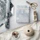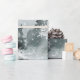 Das elegante Geschenkpapier mit Aquarellmalerei und einem Winternachthimmel in einem schneebedeckten Bergwald mit großen und kleinen Schneeflocken.