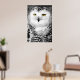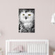 Dieses wunderschöne Plakatprint zeigt ein nahes Foto der atemberaubenden Schneeeule. Als junge Weiße hat sie einen runden Kopf mit weißem Gesicht, schwarzem Schnabel und schönen gelben Augen. Der Absturz von Weibchen und jungen, schneebedeckten Eulen ist markanter als der des männlichen Geschlechts mit schwarzen horizontalen Balken oder Falten. Männliche schneebedeckte Eulen können fast rein weiß sein.
