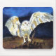 Diese schneebedeckte Eule ist kurz davor, in den Flug zu starten.