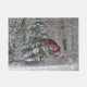 Eine rote Scheune, die durch schneebedeckte Bäume guckt.