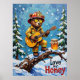 Dieses charmante Kunstwerk zeigt einen Bären, der als Feuerwehrmann verkleidet ist, mit Helm und Sonnenbrille, der auf einem schneebedeckten Baumzweig eine akustische Gitarre spielt. Ein Honigglas liegt in der Nähe der verschneiten Landschaft, umgeben von schneebedeckten Bäumen unter einem weichen blauen Himmel mit fallendem Schnee. Das Gemälde verwendet dicke, strukturierte Pinselstriche, die ein skurriles und herzzerwärmendes Gefühl verleihen, mit "Liebe My Honey", geschrieben unten.