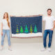 Ein moderner geometrischer Entwurf von fünf Tannenbäumen im Grün, im Türkis und im goldenen Gelb. Der Himmel ist Marine mit weißem fallendem Schnee.