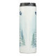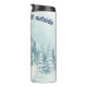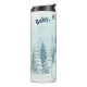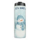 An elegant, traditional watercolor depiction of a winter scene. A friendly snowman, painted with soft blue and white washes, stands proudly wearing a striped scarf and a cozy pom-pom hat. The background features a forest of snow-laden evergreen trees rendered in muted blues and greens, creating depth. The illustration is accented with crisp blue snowflakes falling from the pale sky. The classic phrase 'Baby, it's cold outside' arches gently above the scene. This artwork captures a quiet, nostalgic, and beautiful feeling of a cold winter's day