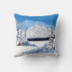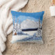 Ein Kissen mit einer schönen Winterlandschaft inklusive schneebedeckten Bergen, rustikaler Hütte und schneebedeckten Evergreens. Text kann personalisiert oder gelöscht werden. Original-Kunstwerk von W.B.