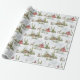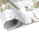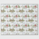 Dieses Weihnachtsverpackungspapier bietet schneebedeckte Blockhütten und rote A-Rahmen-Kabinen mit Reh und Rentieren im Schnee.
