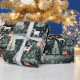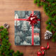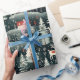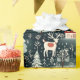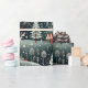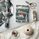 Eine üppige, schneebedeckte Winterlandschaft mit weißem Reh, die auf schneebedeckten Feldern mit rot-weißen Bauernhäusern umherläuft und von herzhaften Winterkiefern umgeben ist.