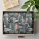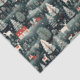 Eine üppige, schneebedeckte Winterlandschaft mit weißem Reh, die auf schneebedeckten Feldern mit rot-weißen Bauernhäusern umherläuft und von herzhaften Winterkiefern umgeben ist.