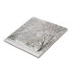 Das Design zeigt ein Foto von schneebedeckten Bäumen im Wald.