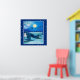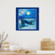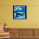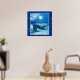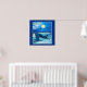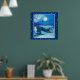 Ein aquamariner und dunkelblauer Snowy-Star-Hintergrund mit einem Schneemann und einem fliegenden Weihnachtsmann auf seinem Schlitten, der Rentiere durch die Fantasiewelt des Himmels schickt.
