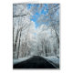 Eine schneebedeckte Winterlandschaft entlang einer kurvenreichen Straße mit frischem Schnee, der an den Bäumen klammert, und einem schönen, hellen blauen Himmel.