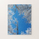 Eine schneebedeckte Winterlandschaft, die durch schneebedeckte Bäume an einem strahlend blauen Himmel schaut.