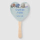 Hochzeitsfans mit Muscheln und blauem Text. Die eine Seite hat die Namen des Ehepaares mit dem Hochzeitstag, und die andere Seite hat das Sprichwort "Von diesem Tag an haben und halten". Das Hintergrundbild ist eine hellblaue Grafik mit realistischen Muscheln über der Oberseite auf beiden Seiten. Das Design wird auf den Herzklappenventilatoren gezeigt, aber das Design funktioniert in allen anderen Formen.