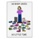 A cartoon lady standing with several pairs of different shoes, boots, sandals, in different colours, looking excited. The Image has the words 'So many shoes, so little time' around it.