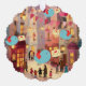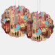 A charming evening scene in a quaint village courtyard with vibrant balloons and birds carrying love letters. Warm lights illuminate the street as people gather under festive decorations.
