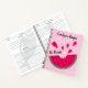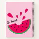 Dieses hübsch rosa Notebook ist so konzipiert, dass es Ihre Rezepte aufnimmt. Der Single ist mit einem hellen, saftig roten Wassermelone-Slice mit einem Biss und einem Herzenmuster geschmückt. Der Hintergrund ist blassrosa und kann mit Ihren Worten und Namen personalisiert werden. Die Rückseite des Notebooks hat auch das Wassermelondesign.