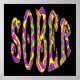 Lila, rosa, gelbe und grüne Swirl-Stilbriefe bilden das Wort Sober in den 60er Jahren inspiriert Retro-Grafik