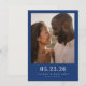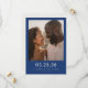 Diese Hochzeit-save-the-date-Karte verfügt über ein modernes und elegantes Design mit einem sauberen, minimalistischen Layout. Die oberen zwei Drittel zeigen ein Foto eines Paares, das von einem marineblauen Rahmen umgeben ist, der sich schön von den helleren Tönen im Bild abhebt. Unter dem Foto ist das untere Drittel Text gewidmet, der vor demselben marineblauen Hintergrund gesetzt ist und eine einfache Serifenschrift für ein anspruchsvolles Aussehen verwendet. Die Gesamtoptik ist verfeinert und zeitgemäß und perfekt, um den Ton für eine bevorstehende Feier zu setzen.
