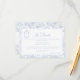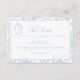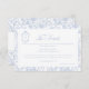 Delft blue floral wedding details card, designed in a refined blend of chinoiserie and French toile de Jouy style. The soft botanical illustrations frame an arched layout featuring an elegant wedding crest monogram, perfect for couples who love vintage, historic, and European-inspired aesthetics. Classic script typography pairs beautifully with the ceramic-blue palette, making this design an effortless nod to the tradition of “something blue.” Fully customizable with your names, date, and location, it’s an exquisite choice for any romantic or sophisticated wedding theme.