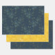 Papier mit eleganten, zarten Sprigs aus goldenen Konturen orchid Blume und Knospen auf marineblau Hintergrund und gelb strukturiert Hintergrund. Graceful Blütenblüte Botanik Wrapping Paper. Soft Blue Orchid Collection.