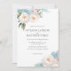 Elegante botanische Hochzeitseinladung mit einer Dekoration aus sanft blauen und rosa Blume und elegantem grünem Blattwerk an den Ecken. Ihre Hochzeitsdetails, Braut und Bräutigam werden elegant in einem schicken Serif-Schriftart dargestellt. Auf der Rückseite befinden sich zusätzliche Details und ein QR-Code, der die Karten des Gehäuses optional macht.