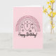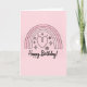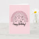 Soft pink birthday card with a minimalist rainbow design and a simple line art heart shape at the center with the words ' Happy Birthday' written underneath.