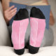 Pink and white. A soft watercolor mix, delicate hearts and curved lines. Text on both socks, but not in the same place. Still cute though.