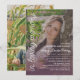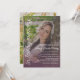 A memorial service invitation with your loved one's photo as the base, printed all over the card. A transparent color filter as an overlay gives the photo a softly muted look and helps the white text pop. There's also a soft purple gradient at the bottom to further make the text legible. Add another photo to the back. This invitation works well for funeral services, memorial services, life celebrations of mothers, sisters, daughters, grand-mothers, and wives, with the pretty feminine hand-writing script written across the side of the invitation that says in loving memory. This works best with a 1/2 body portrait taken from the waist up, so that the text frames your loved one's face.