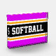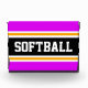 Dieses sportliche, sportliche Design mit fett formatiertem SOFTBALL-Text in einem hervorgehobenen, schwarzen, breiten, mittleren Streifen mit weißen und gelben pinstripes und einem lebendigen, hellen, tropisch rosa Außenstreifen. Der Text kann personalisiert sein.