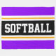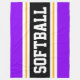 Dieses sportliche, lustige Design enthält fett gedruckte SOFTBALL-Texte in einem schwarzen Mittelstreifen mit doppelweißen und gelben Rennstreifen gegen lila, leuchtende Außenstreifen. Der Text in diesem Design kann personalisiert sein.