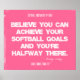 Dieses motivierend Softball-Poster enthält ein Softball-Zitat des Autors und Designers Felicity Luckey für Trainer, Spieler und Teammotivation. Das Bild ist von einem "zerrissen" für Fitness-Erfolgsstoff mit "lose-gewinde"-Schrift. Es gibt insgesamt 12 Softball-Zitate in dieser Great Minds Think Fit™ Serie. Die Softball-Plakate sind in kräftigen, fett gedruckten Farben, dunkelblau-blau und als Multi-Zitat-Collagen erhältlich. Das motivierend Zitat auf diesem Softball-Poster lautet: "Glauben Sie, dass Sie Ihre Softball-Tore erreichen können, und Sie sind auf halbem Wege." ~ Felicity Luckey