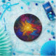 Ein leicht psychedelisches, welliges, wirbelndes, mehrfarbiges Fraktal, das den elektromagnetischen Emissionen der Sonne ähnelt. Das Bild wird auf einem sternförmigen Hintergrund überlagert.