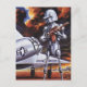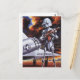 Vintage Illustration futuristische Science Fiction Militärroboter Bild. Ein feindlicher Soldat der Alien, der eine Gewehrwaffe hält und vor einem Militärflugzeug oder einem Flugzeug mit einem Stern stehend ist. Er ist auf einem desolaten Planeten bereit, mit Rauch, Feuer und Explosionen in den Krieg zu ziehen. Zeit zum Kampf und Kampf gegen die bösen Außerirdischen. Classic 50er Retro Comic Buch sci fi design.