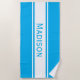 Genießen Sie dieses personalisierte Badetuch am Strand oder am Pool. Dieses Design hat eine solide himmelblaue Hintergrundfarbe mit weißen Streifen und einem modernen Schriftart. Dies ist ein großartiges Geschenk für Familienurlaub, Partys oder Veranstaltungen. Name und Farbe können in den Personalisierungsoptionen angepasst werden.