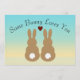 Some Bunny Love Loves You has the silhouette of two rabbits over a blue and yellow gradient background. Between the ears of the two rabbits is a red heart. The text above, that reads "Some Bunny Loves You" and the "Happy Easter" Text, on the inside can, can be customized to for any occasion, such as a Easter, birthday, anniversary or just to say hello.