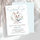 Dieses Design beinhaltet das Thema "Somebunny Sweet Is On The Way" für Baby-Babydusche mit pastellblauem Gingham kariert und niedlichem, weißem Kaninchen-Hase mit blauer Osterei-Abbildung. Dieses Produkt kann leicht mit Ihren persönlichen Veranstaltungsdetails personalisiert werden.