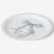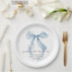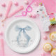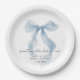 Elegant paper plates for her bridal shower featuring a vintage blue coquette bow watercolor, "something blue before I do" in a chic calligraphy script, and the bride's name and the shower date in classic serif typography.