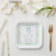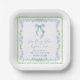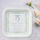 Chic bridal shower paper plates featuring vintage grandmillenial-inspired green scallop and blue floral hand-painted watercolor frames, a delicate blue coquette bow watercolor, "something blue before I do" showcased in an elegant calligraphy script, and the name of the bride and shower date in classic serif typography.