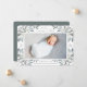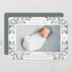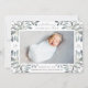 Elegante botanische Geburtenankündigung in schick grünen Farbtönen mit einem Single voll bluten horizontalen oder landschaftsorientierten Foto mit Haufen von zarten staubigen, grün-grauen Aquarellfarben-Blätter und weißen Beeren an den Ecken. Personalisieren Sie Ihre Daten mit dem Namen des Babys, den Geburtsstatistiken und einer persönlichen Nachricht, und fügen Sie drei zusätzliche quadratische Fotos hinzu.