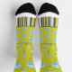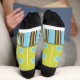Sommergartensocken mit grünem Hintergrund und blauen und gelben Blume mit blauen Vögeln und einer gestreiften Fläche von braun, grün, weiß und blau in der Nähe der Zehen.