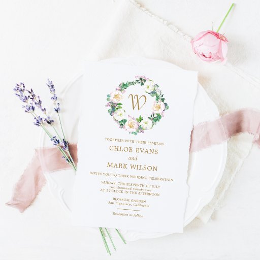 Sommerlush Blütenfarbe Monogram Einladung Hochzeit. Matching Items verfügbar.