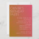 Diese Geburtstagsfeier lädt mit einem lebendigen, hitzewellen-inspiriert Hintergrund ein. Die warmen Farbtöne, die von goldfarbener Orange bis feuerrot reichen, prägen das Wesentliche eines heißen Sommertages. Der kühne, moderne Schriftart zeichnet sich durch große Buchstaben aus und sorgt für den Pop der Veranstaltung gegen den schimmernden, wellenartigen Verlauf. Minimalistische Akzente wie ein Martini-Glas oder Zitrusscheiben sorgen für eine lustige Touch, ohne das Design zu übertreiben, und geben ihm ein lebendiges, sommerliches Ambiente, das perfekt für einen festlichen Abend ist.