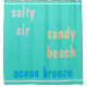 Türkisblaue grüne, solide Hintergrundfarbe. Salzige Luft, Sandstrand, Brise-Typografie in Pastellrosa, Bräune und Blau. Weiße geometrische Streifen. Entwürfe von TamiraZDesign.